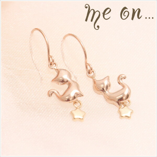 me on... K10ピンクゴールド 猫モチーフ&K10イエローゴールド星チャームのフックピアス お届けまで2〜3週間程度 送料無料 プレゼント 春夏